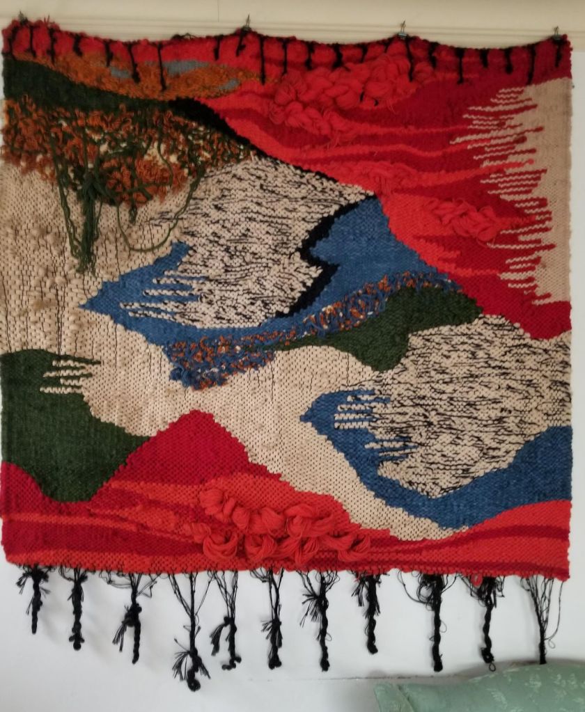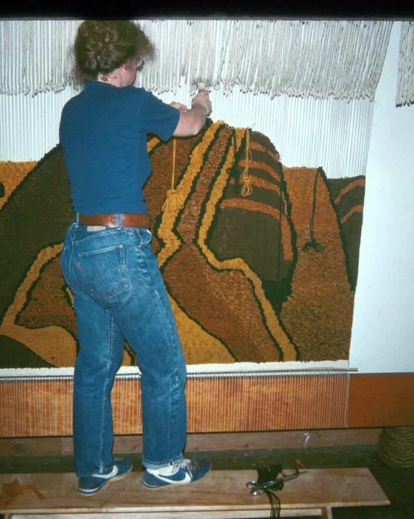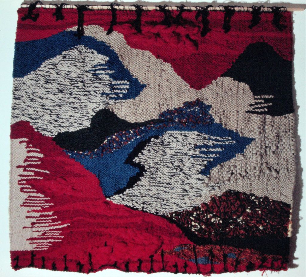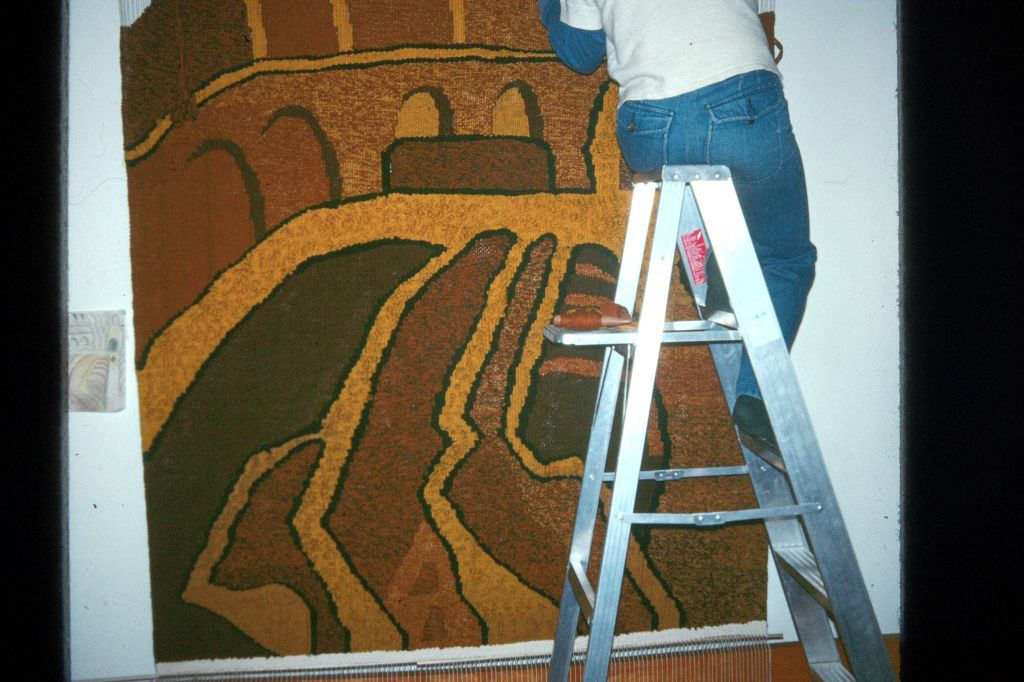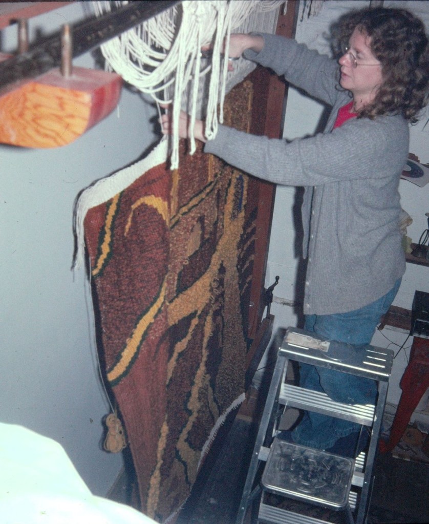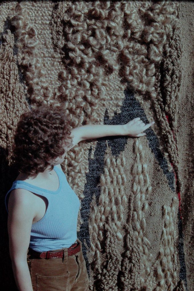 In the beginning of the 1970s, when I was in my twenties, I took a ride share from Wisconsin to LA, then hitch-hiked up Highway 1, to begin a new chapter of my life in Berkeley, California. For reasons, unknown to me—a young woman looking to find my way in the world—I’d studied literature at UW Madison, got involved with independent films, but sunk my heart into weaving. I went to Berkeley to study with a weaver and, after a couple years I rented a space in a warehouse on Adeline and Shattuck Avenue. This studio was big enough to hold several looms, including an upright loom that was about eight feet wide and ten feet high, built by a carpenter friend. Once I strung the warp, I took soft, fuzzy balls of wool and, unspooling them onto a shuttle, wove them through the warp, forcefully tamping them down, pounding on the newly laid in weft with a pick.