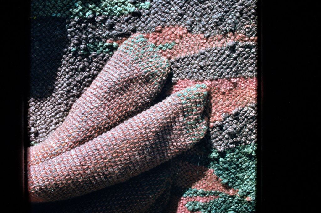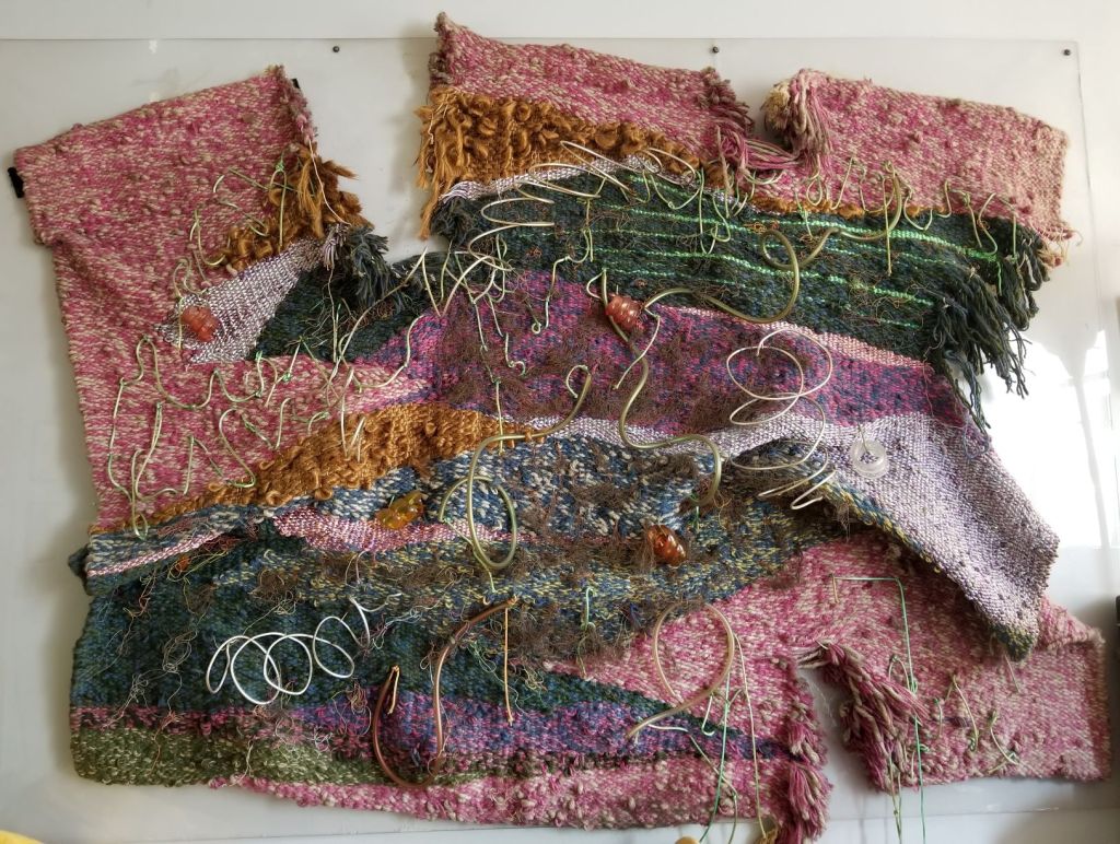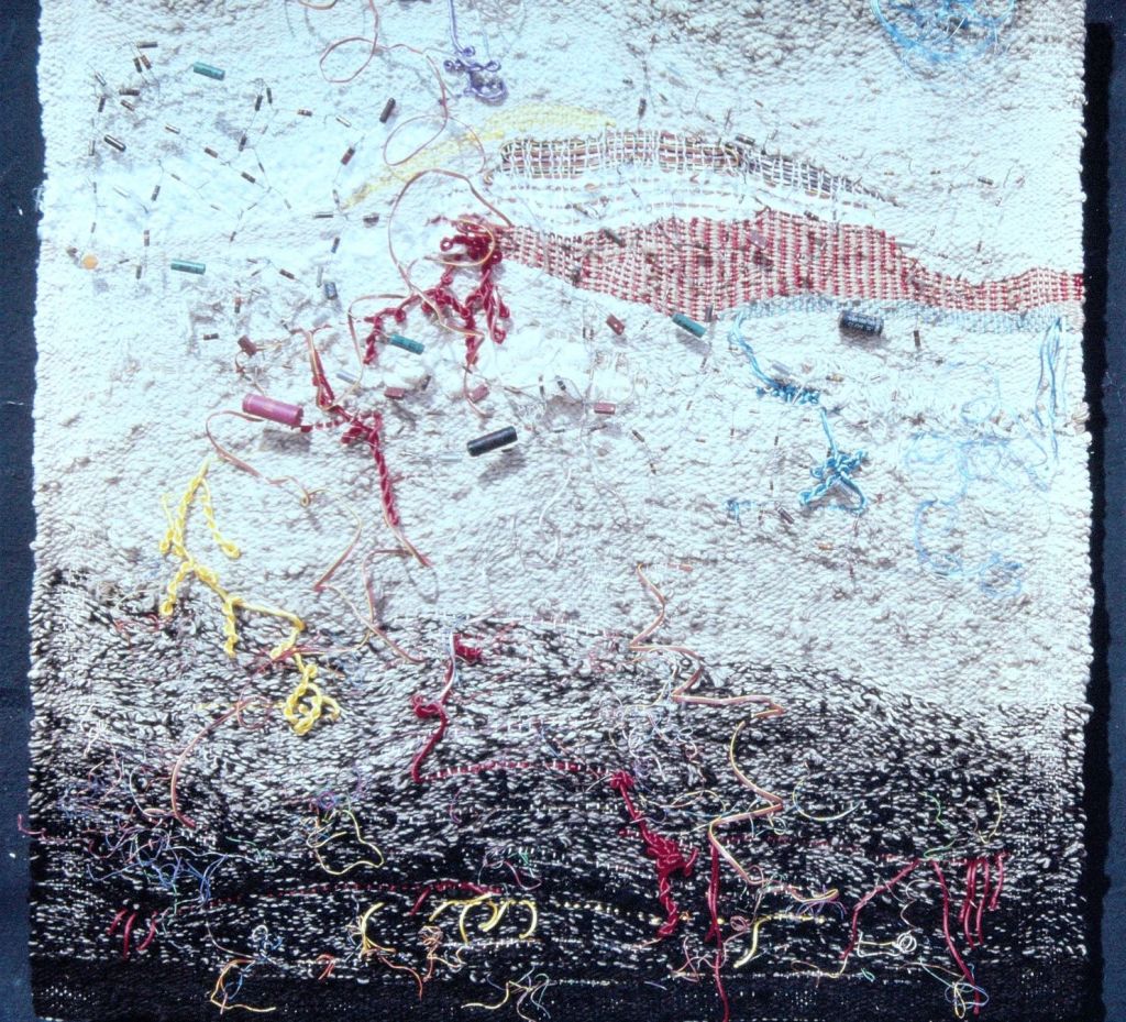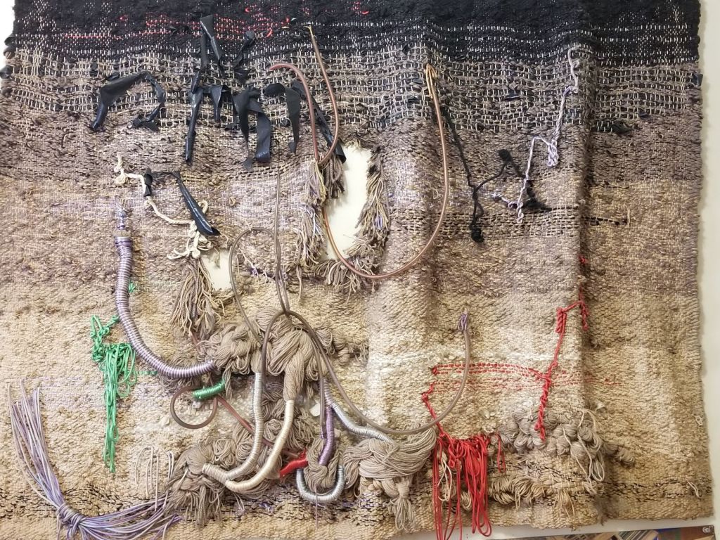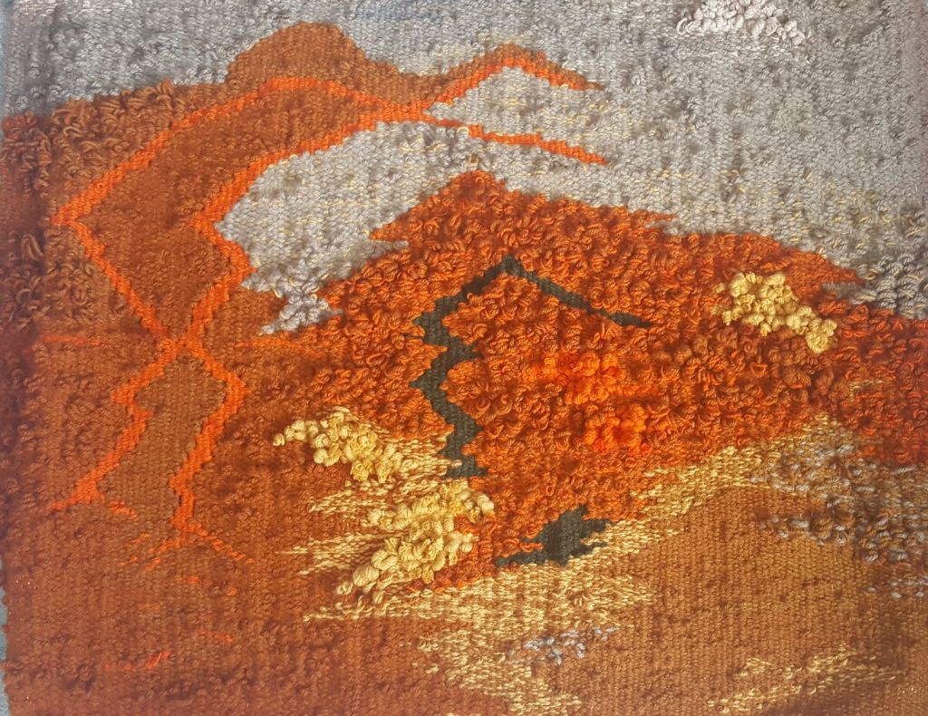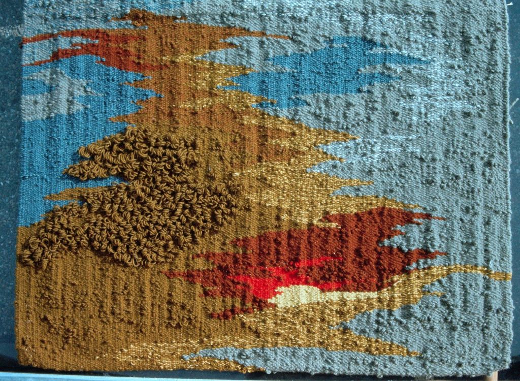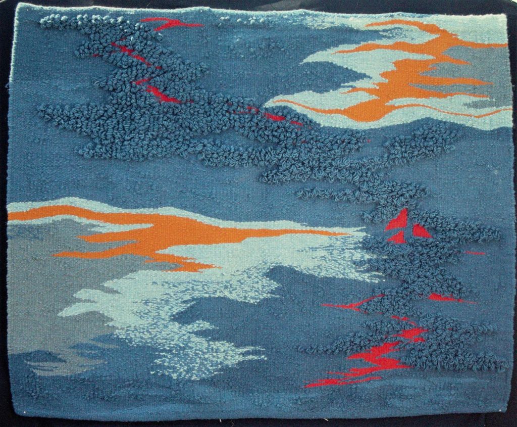 In the beginning of the 1970s, when I was in my twenties, I took a ride share from Wisconsin to LA, then hitch-hiked up Highway 1, to begin a new chapter of my life in Berkeley, California. For reasons, unknown to me—a young woman looking to find my way in the world—I’d studied literature at UW Madison, got involved with independent films, but sunk my heart into weaving. I went to Berkeley to study with a weaver and, after a couple years I rented a space in a warehouse on Adeline and Shattuck Avenue. This studio was big enough to hold several looms, including an upright loom that was about eight feet wide and ten feet high, built by a carpenter friend. Once I strung the warp, I took soft, fuzzy balls of wool and, unspooling them onto a shuttle, wove them through the warp, forcefully tamping them down, pounding on the newly laid in weft with a pick.