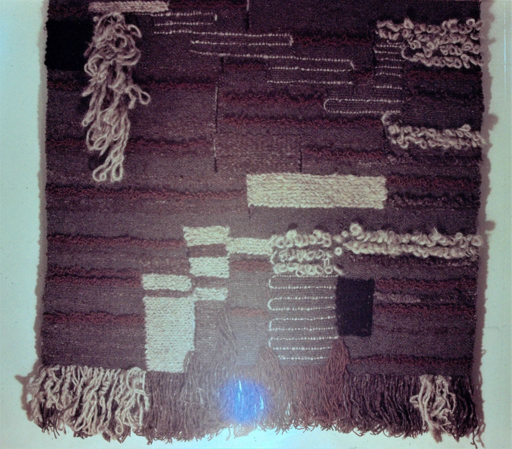 But there was no time to linger. I got online and ordered a gismo to transfer slides to digital files. Once I digitized them, I saved them to my computer. I looked at them together and stopped. Had I really done all these? Some I didn’t even remember. Others I did remember, but there were no records of them. Looking at the remaining images of my work, I can see a progression that I’m not sure I was even aware of at the time. What comes back to me now is the process of making the works, the hours of planning, weaving, fingers pulling cotton warp out, passing yarn through, then pounding it down, tight. The resulting weavings themselves are merely artifacts. Do they symbolize anything beyond themselves, anything besides form, texture, color, and the time and effort to make them? Or are they like my dead mother’s rosary, though meaningless to non-religious me, it’s not the symbolism of the beads, but their concrete physicality that conjures her.
